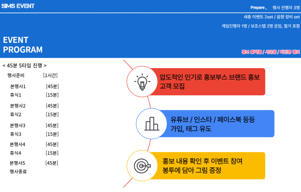 게임진행자 1명 / 보조스탭 2명 운임, 철거 포함